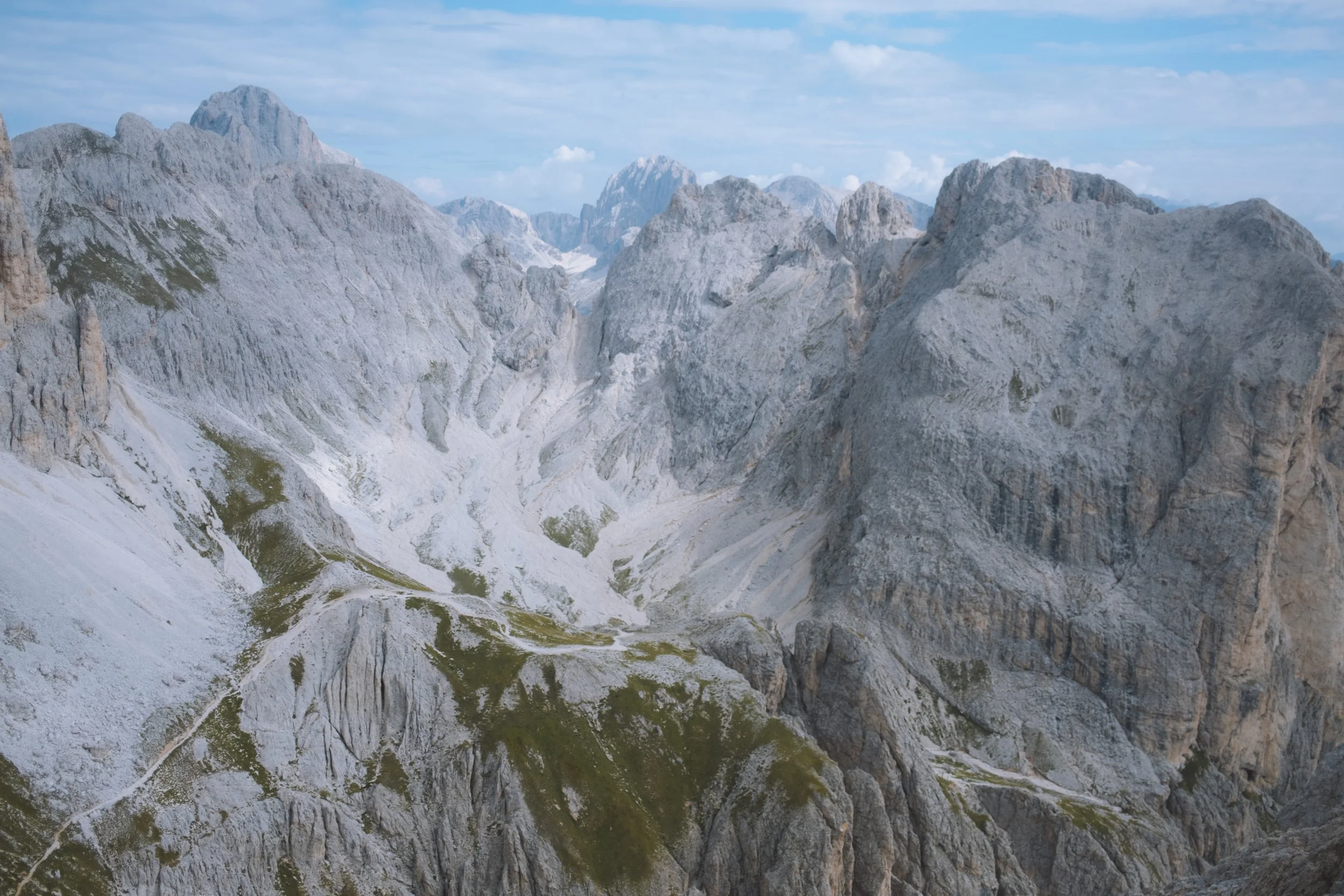 From there I did attempt to ask if it was possible to bypass the Via Ferrata dei Campanili del Latemar but… nobody understood what I was asking and I eventually gave up and decided that I was in need of an exploratory mission. I walked along the backside of the Gruppo del Latemar - an absolutely breathtaking landscape of white rock and meandered up the col to the entrance of the Via Ferrata dei Campanili del Latemar. It was extremely clear that without equipment this was not physically possible. Not just recommended but explicitly mandatory. And so if you cant go through it… maybe you can go around it. And that I did!